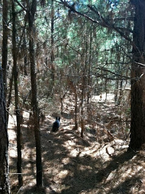 I was somewhat disappointed as I headed back towards my old, familiar path. As I approached the gate, Emma took off in the woods in a clearly defined old-path/roadway. "This must be the old logging road!! Dare I navigate my way through it? YES, yes indeed!!"